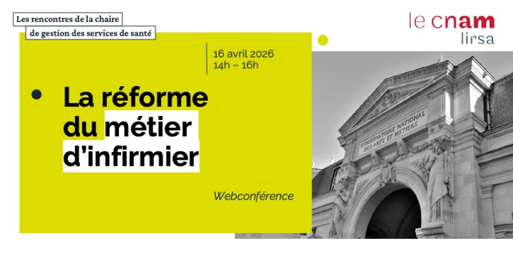 La réforme du métier d’infirmier16 avril 2026Webinaire - WebconférenceLes Rencontres de la chaire de Gestion des services de santé discuteront les changements majeurs permis par la réforme du métier d’infirmier : une plus grande reconnaissance des compétences pour renforcer l’accès aux soins sur l’ensemble du territoire. -