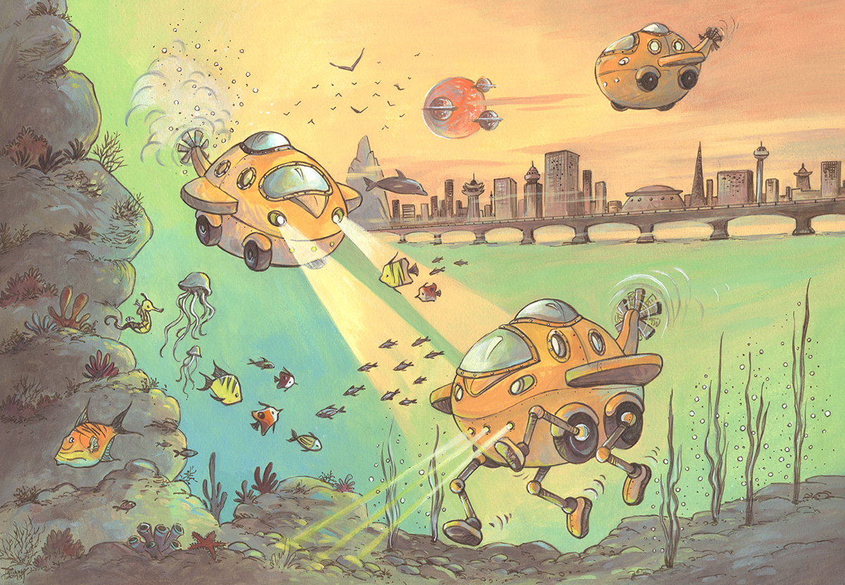 Ce véhicule d'exploration écologique se plaît aussi bien sur terre ou dans les airs que dans les profondeurs des océans. Sa vocation première est de parcourir les airs, pilotée par une sorcière. Elle reste un très bon Taxi Écologique pour tout citoyen respectueux de l'environnement et désireux de se déplacer en un clin d'oeil sur notre planète.